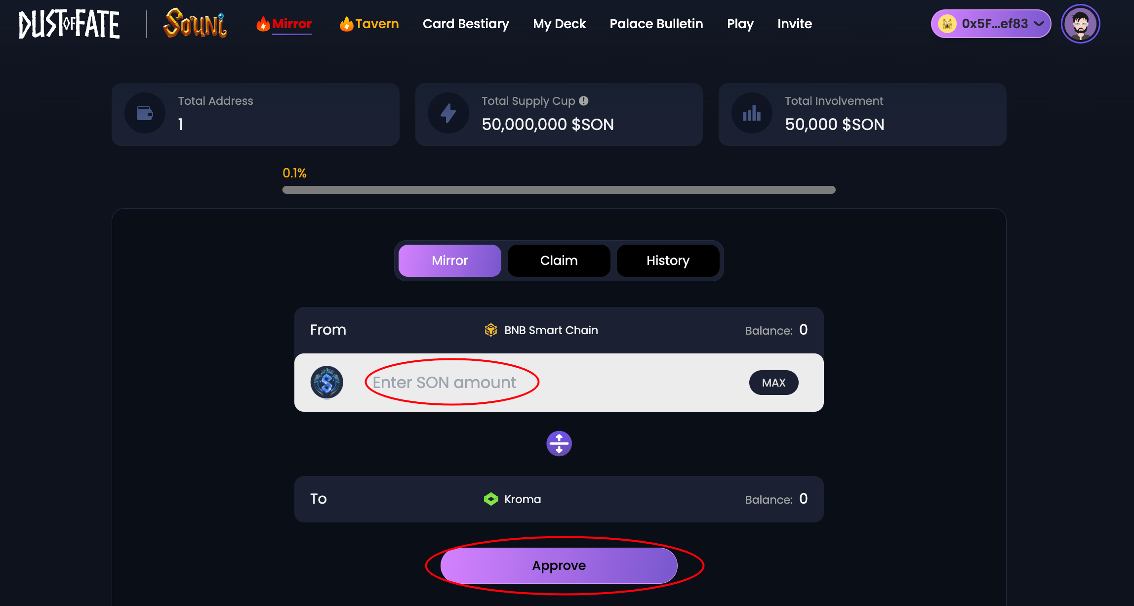 3. Enter the $SON amount you want to mirror to Kroma, then click "Approve"