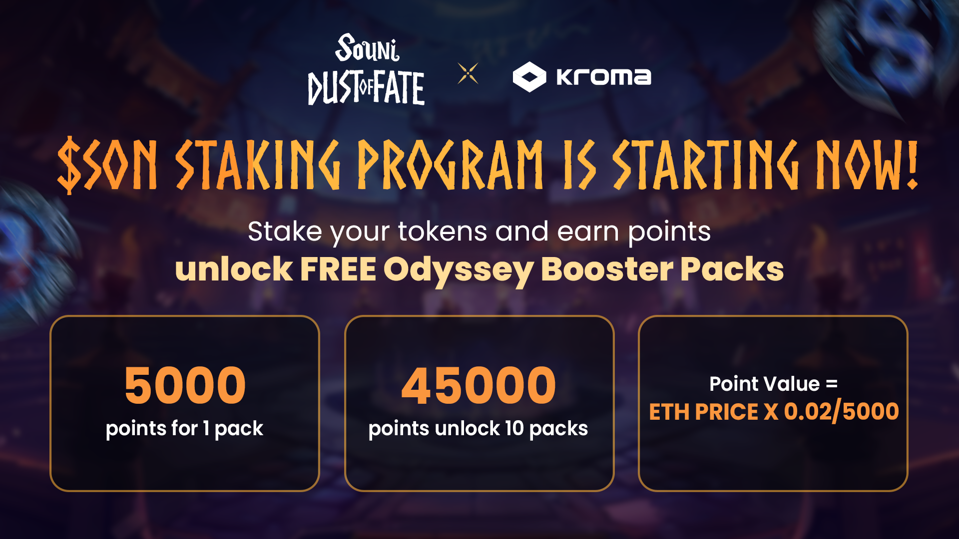 We're rolling out the $SON Staking Program to boost user rewards and fulfill our mission. Join now to stake $SON, earn points, and unlock exclusive Odyssey Booster Packs. Start leveraging this opportunity to benefit from your engagement with Souni Dust Of Fate.